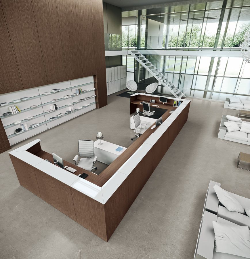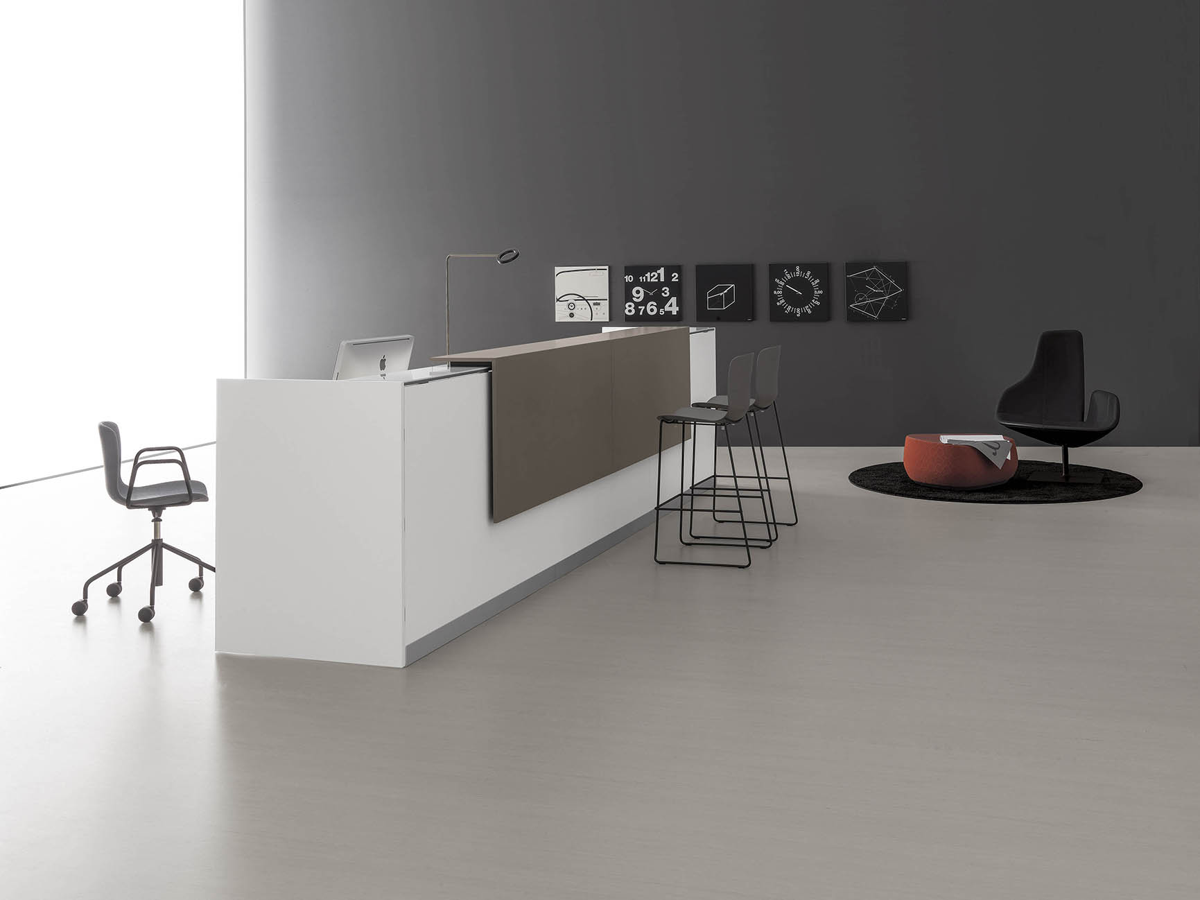 la collezione si presenta come elemento dedicato all'accoglienza. Caratterizzato da elementi semplici che, accostati tra di loro, definiscono lo spazio di primo contatto. Conferisce alla reception un'immagine fresca e dinamica. Cinque tipologie di moduli consentono di ottenere composizioni in grado di soddisfare qualsiasi esigenza funzioanle. Il disegno ricercato e particolare dei top terminali, caratterizza e rende riconoscibile lo stile di questa reception, anche nelle composizioni più semplici e lineari.